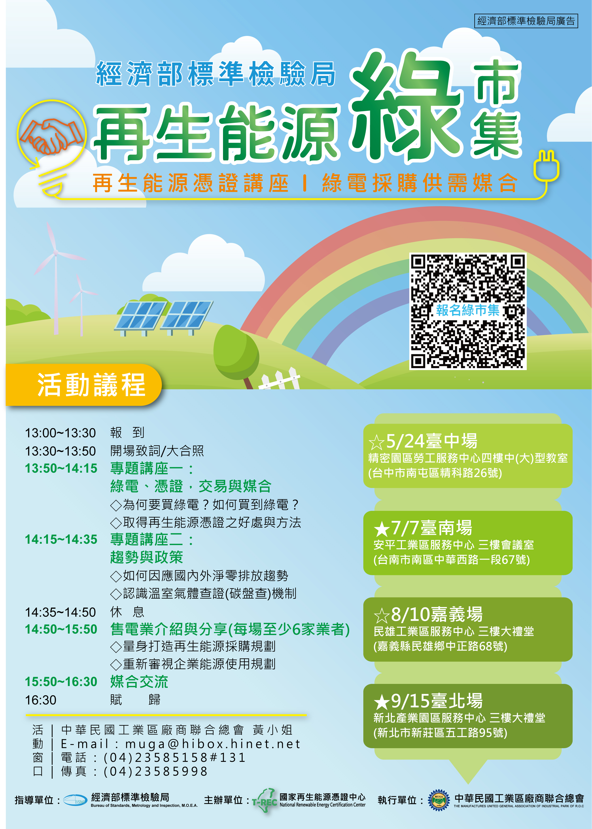 隨著國際綠色永續觀念抬頭,企業對於再生能源需求日漸提升,經濟部標準檢驗局自112年第二季起,陸續於北、中、南各地舉辦「再生能源綠市集」活動,為綠電供需雙方提供線上及實體媒合平台,促進再生能源買賣雙方快速媒合機會。