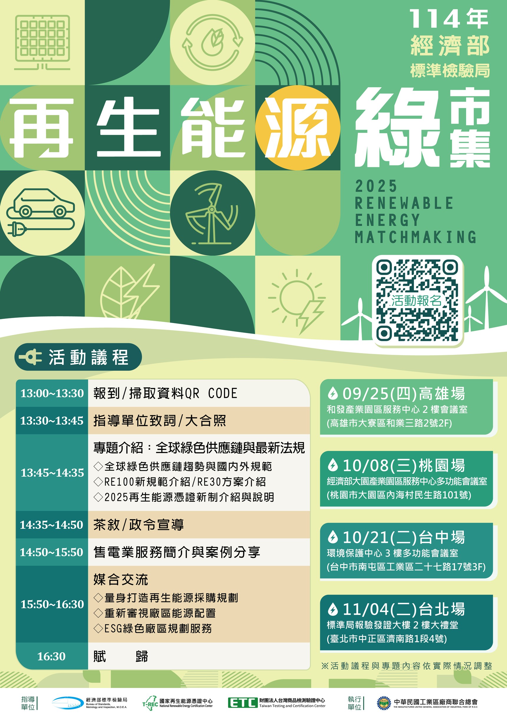 我國再生能源憑證市場自107年啟動以來,迄今累積交易量已突破800萬張憑證。為協助在地企業證明綠電使用、實踐永續目標,經濟部標準檢驗局推動「單一電號多用戶」及「綠色租賃」等示範計畫,使非電號持有企業亦能佐證其環境效益。今(114)年5月,標準局公布修正《再生能源憑證實施辦法》,其目的除擴充查核量能外,並新增1 MW 以下轉供發電設備簡化申請流程,以加速需求者取得憑證時程。為強化中小企業綠電採購媒合及優化交易流程,將於今年9月下旬至11月上旬,與中華民國工業區廠商聯合總會合作,於北、中、南辦理「再生能源綠市集」系列活動,敬邀有綠電需求之企業踴躍參加。