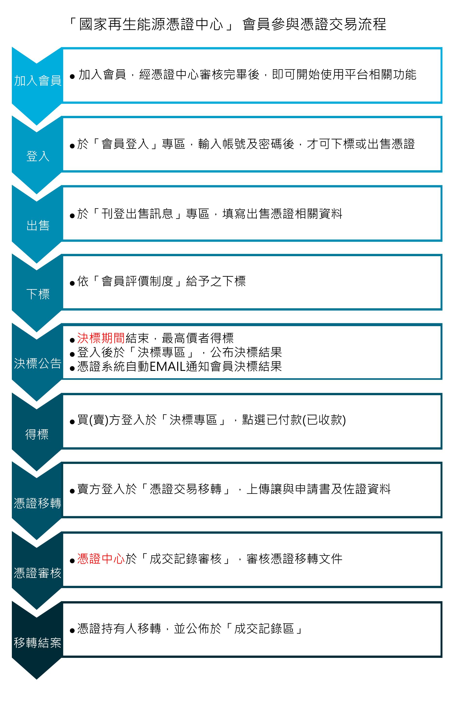 本中心因目前憑證交易多為買賣雙方自行議價,為便利憑證交易,擬於國家再生能源憑證網路平台(以下稱網路平台)(www.trec.org.tw )新增憑證線上競標交易功能,並擬具「再生能源憑證電子化交易流程表(以下稱交易流程)」(如附件1)、「再生能源憑證中心網站使用條款(以下稱使用條款)」(如附件2)以及「電子化交易行為評價制度(以下稱評價制度)」(如附件3),以明確規範使用人權利與義務,並詳述賣方刊登出售訊息、買方下標與決標後續相關作業程序。